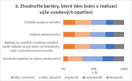 V oblasti bariér pro realizaci opatření pro slaďování jsou jako podobně významné vnímány chybějící podpora od státu, kterou uvedlo 45 % respondentů, náklady na zavedení a realizaci opatření (44 %) a zvýšená administrativa (44 %). Z dalších důvodů zaměstnavatelé uváděly zejména provozní a organizační důvody.