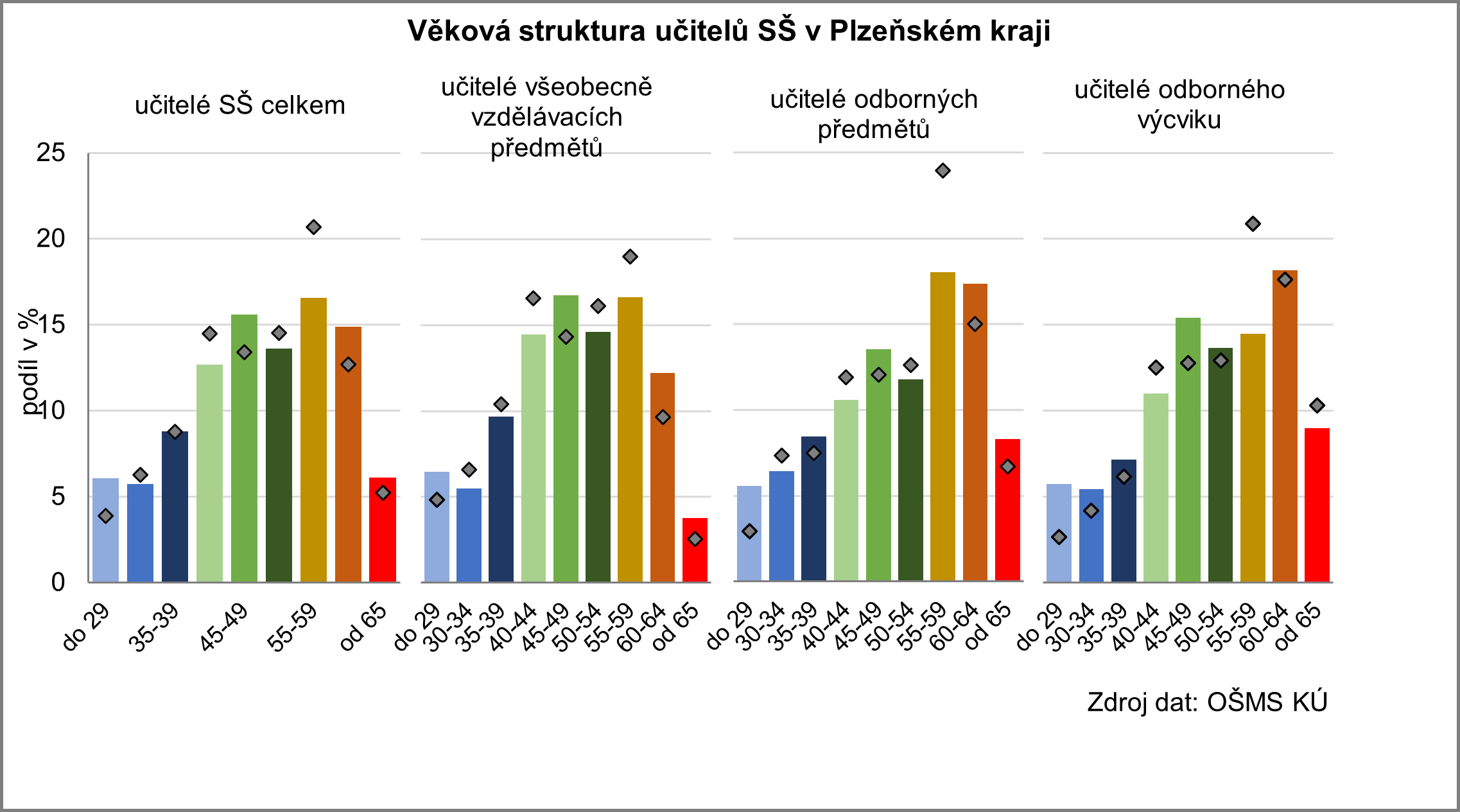 Čeští učitelé stárnou, mladých pedagogů je ve sborovnách minimum. Střední školy nejčastěji shánějí učitele informatiky, matematiky anebo fyziky. Průměrný věk pedagogů středních škol v Plzeňském kraji ve sledovaném školním roce 2021/22 činil 49,2 roku. Nejvíce se omladila věková sktruktura pedagogů odborného výcviku. Naopak ke zhoršení věkové struktury došlo v případě pedagogů všeobecně vzdělávacích předmětů.
